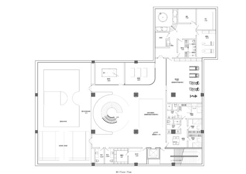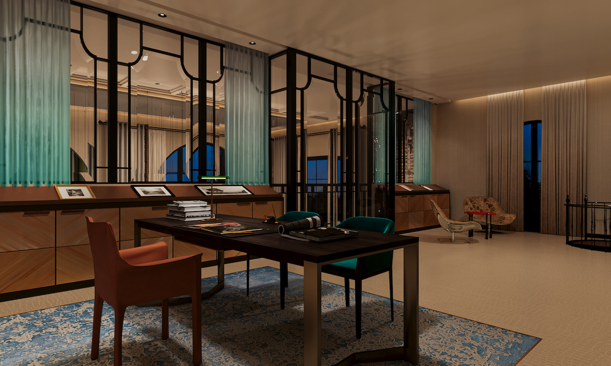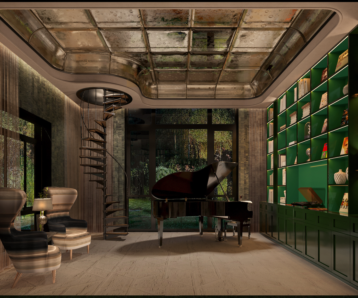 The piano room reads cooler and more meditative, defined by deep greens, lacquer-black accents, and a glass-block ceiling that diffuses daylight into a muted field of texture. A spiralling stair becomes the key design gesture, offering movement and vertical tension.
