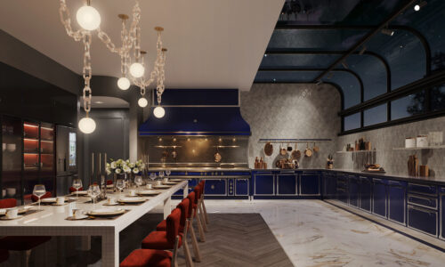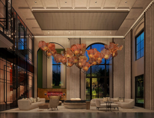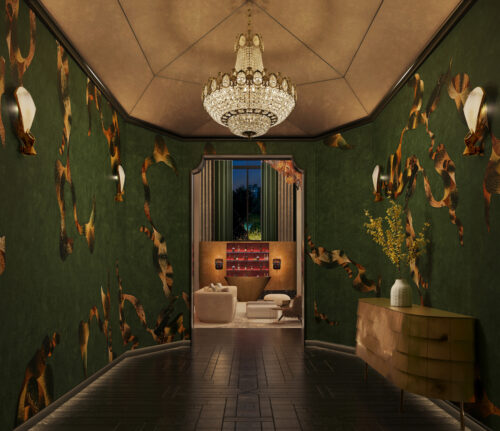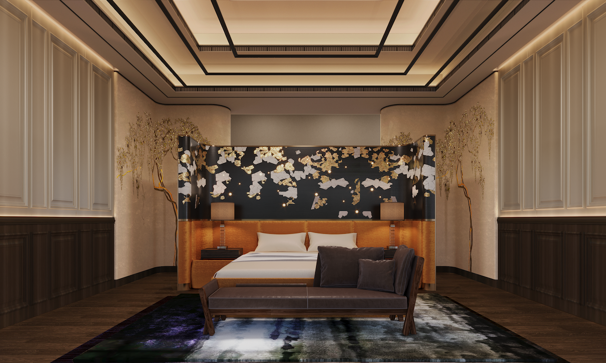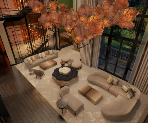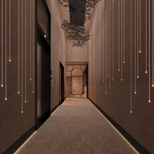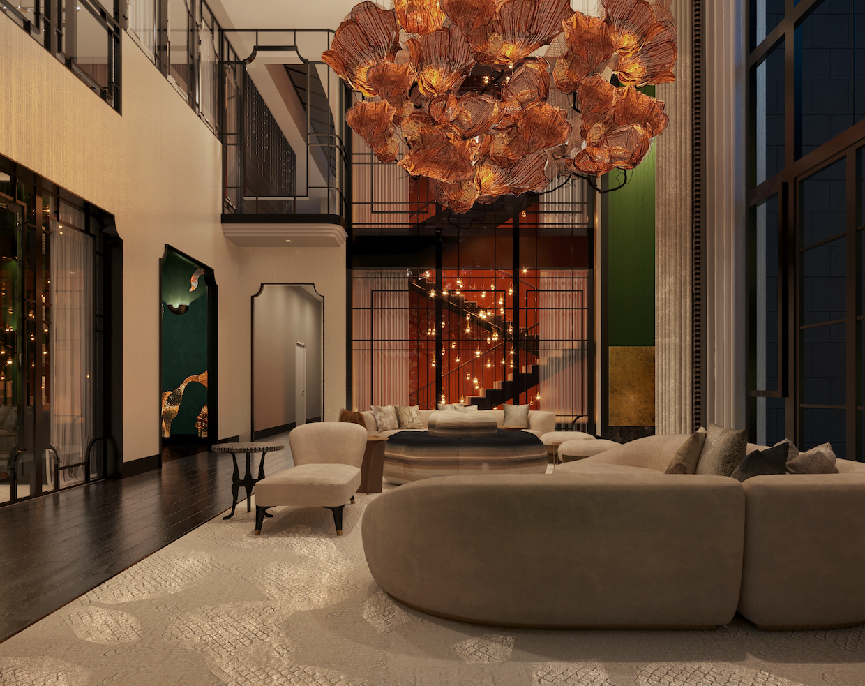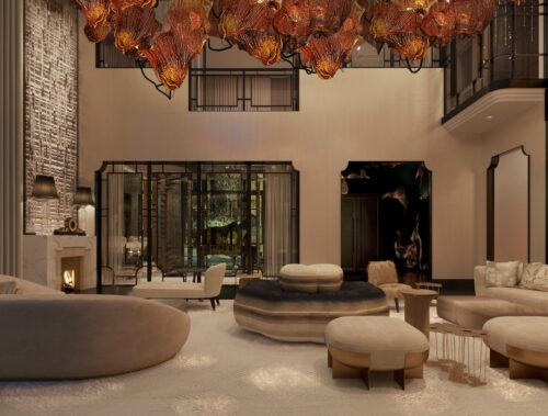 StudioGlam’s 5,000-square-meter Beijing villa takes a distinctly modern stance on Chinese luxury, stripping away ornament in favour of sculptural clarity and controlled warmth. The double-height salon anchors the project with a suspended installation of amber glass petals — part lighting, part spatial graphic — casting a calibrated glow across low, architectural seating and monolithic stone surfaces.