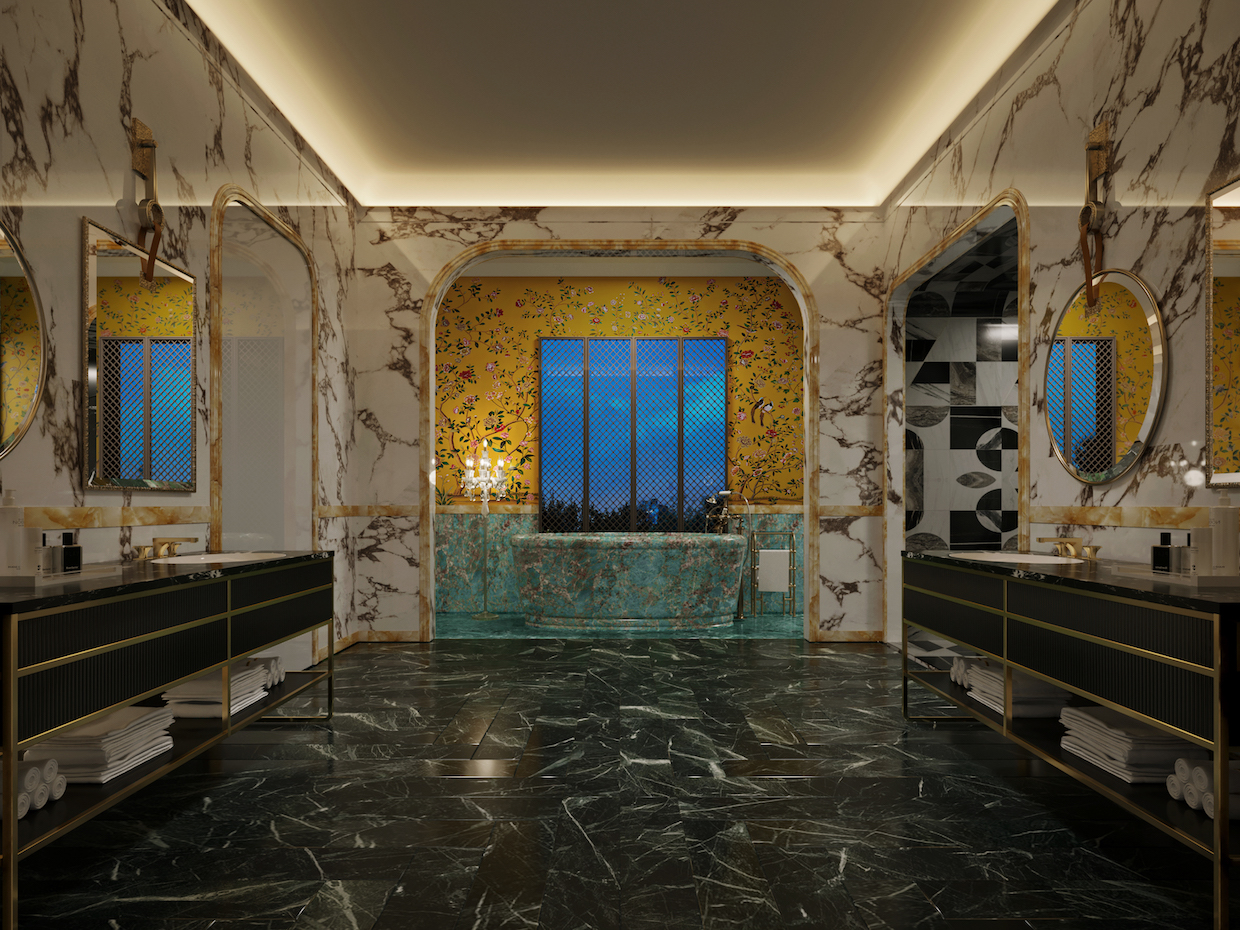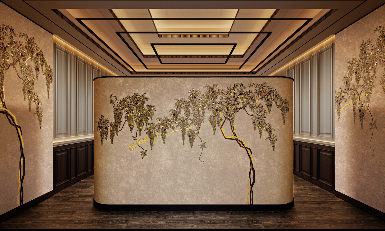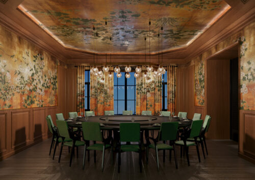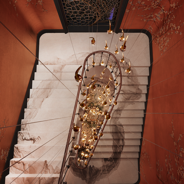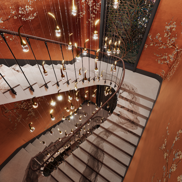 In the main stair hall, golden droplets form a floating constellation above ink-washed treads, while the dining room expands into a continuous botanical mural.