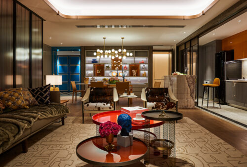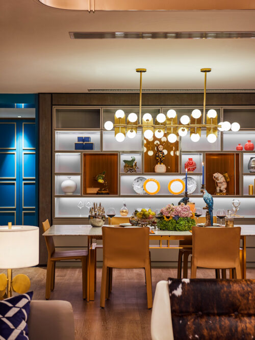The living room expands into a cinematic lounge of cowhide, lacquered red trays, cobalt busts, and couture-patterned cushions — a loungescape that could belong to a fashion editor who collects lovers, not furniture. Xian has never seen colour-blocking this confident.