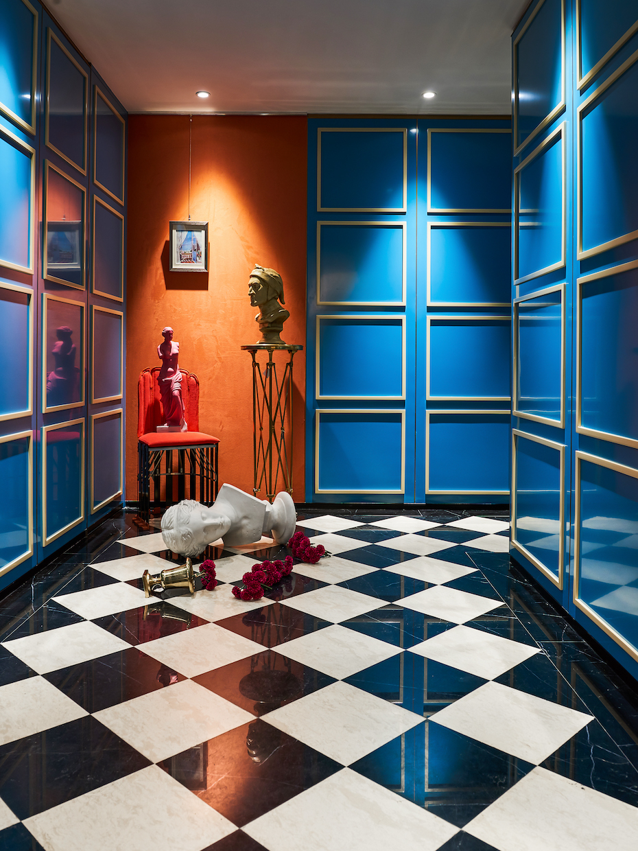 And then comes the entrance: electric turquoise paneling, terracotta walls, and a toppled Greco-Roman bust lying on a black-and-white marble floor like a delicious crime scene. It’s surreal, theatrical, and just the right amount of naughty — a tongue-in-cheek nod to old-world grandeur having a very modern fall.