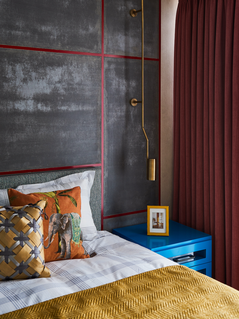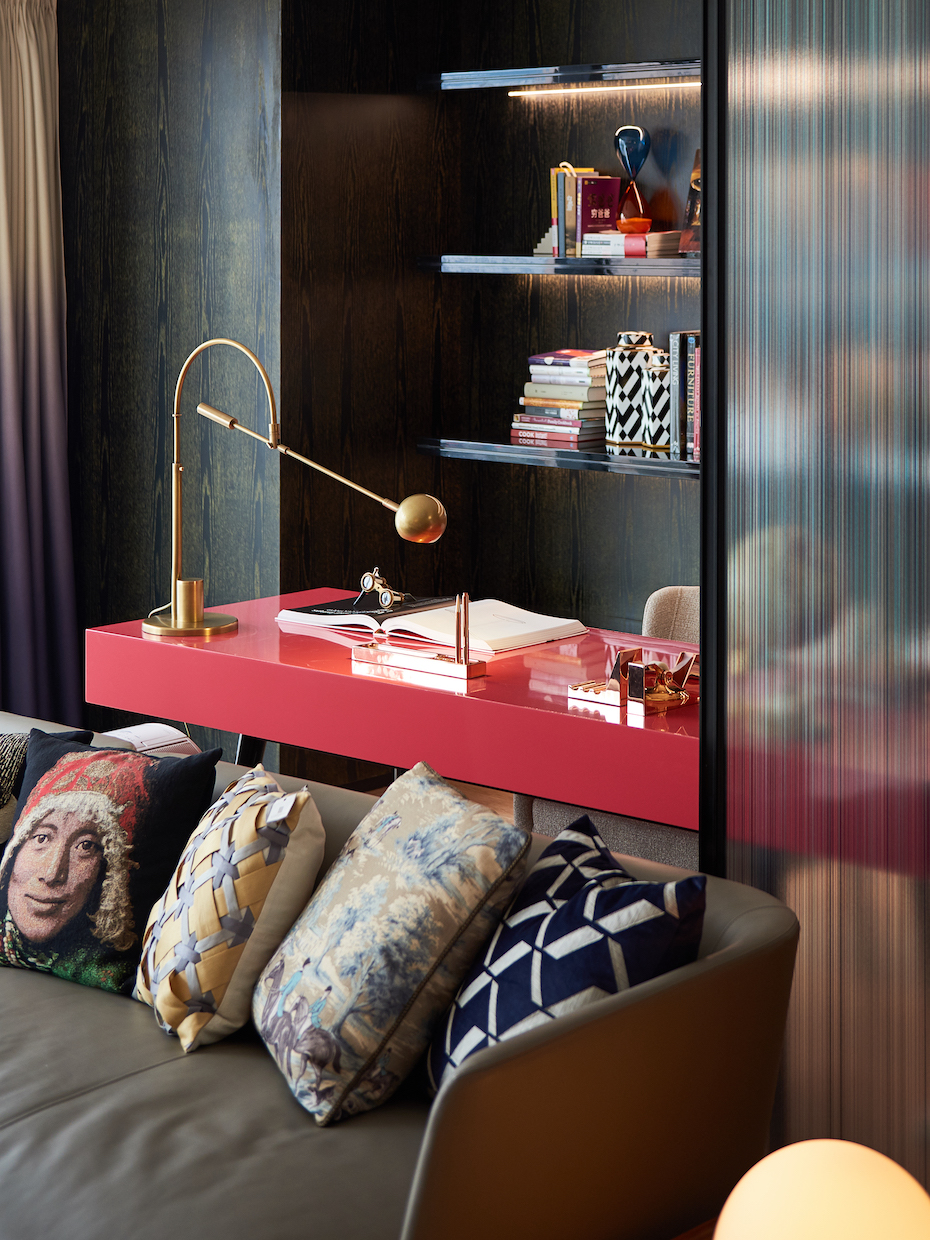 Slide into the study and the mood shifts again: ombré curtains melt from gold to plum, a lipstick-red desk stands like a diva centre-stage, and a globe lamp glows as if plotting its next scandal. Everything feels curated, but with a wicked grin.