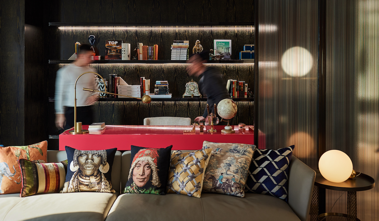 The living room expands into a cinematic lounge of cowhide, lacquered red trays, cobalt busts, and couture-patterned cushions — a loungescape that could belong to a fashion editor who collects lovers, not furniture. Xian has never seen colour-blocking this confident.