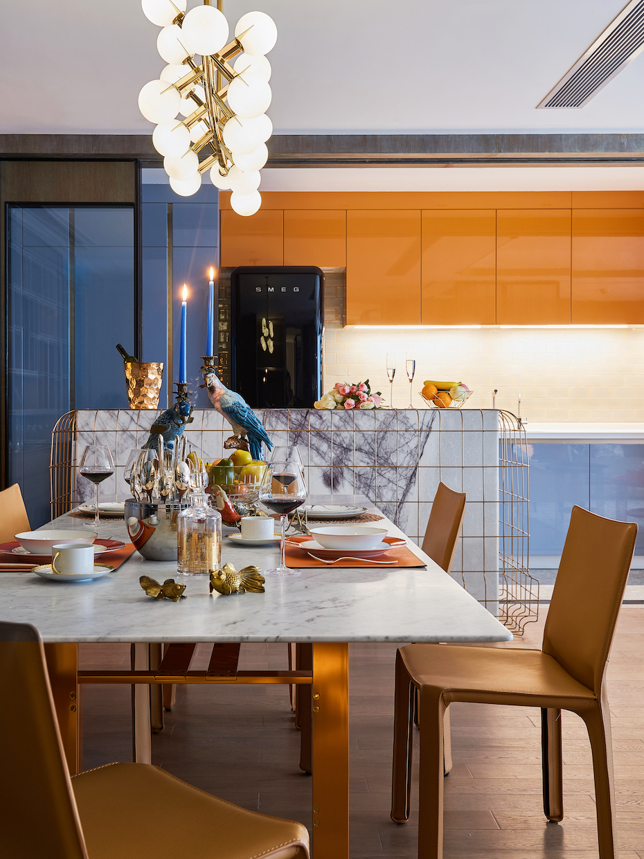 The dining room sets the tone: glossy Sorrento-orange cabinetry, a marble island caged in gold wire like a runaway sculpture, and a flock of porcelain birds presiding over a dinner table that looks permanently ready for a decadent after-party. Overhead, a chandelier drips light like champagne bubbles — StudioGlam never whispers.