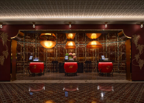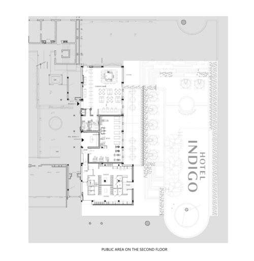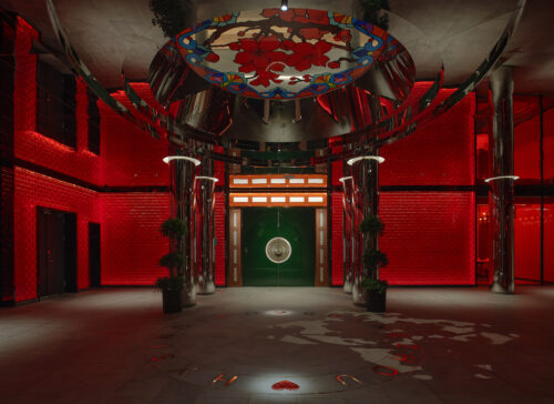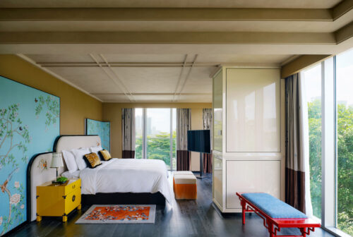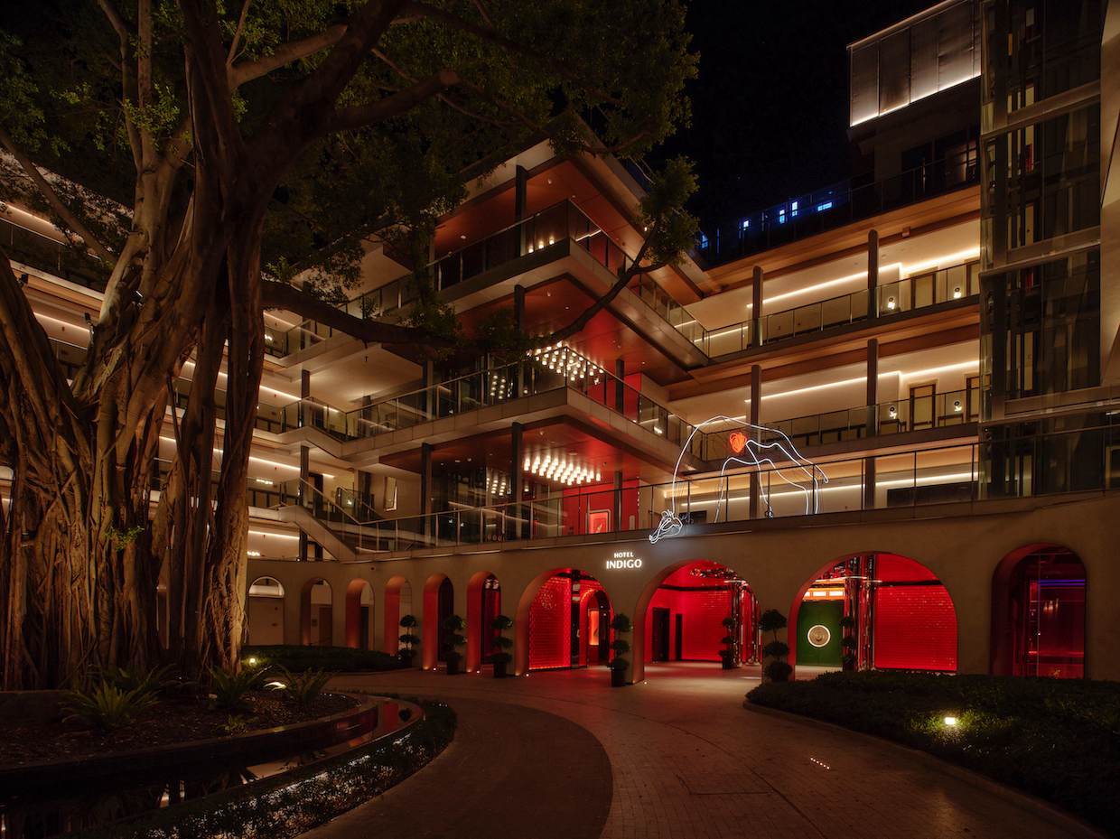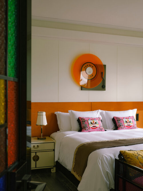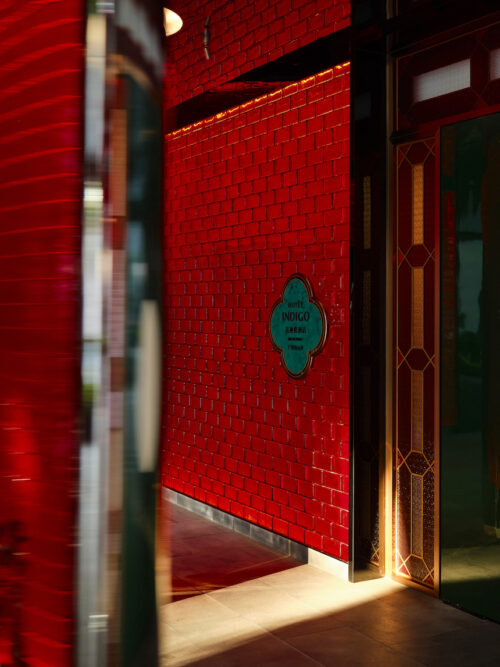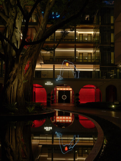 Guests arrive beneath a century-old banyan tree, a local symbol of community and continuity, where a neon giraffe dips its head toward the Indigo sign — a surreal welcome that feels part blessing, part wink. The lobby glows unapologetically red, enveloping visitors in a wash of good fortune and quiet seduction. Front desks shaped like dragon-boat drums pulse with rhythm, while the lounge opposite reimagines the banyan canopy as a sculptural social space — a contemporary tree under which strangers become accomplices.