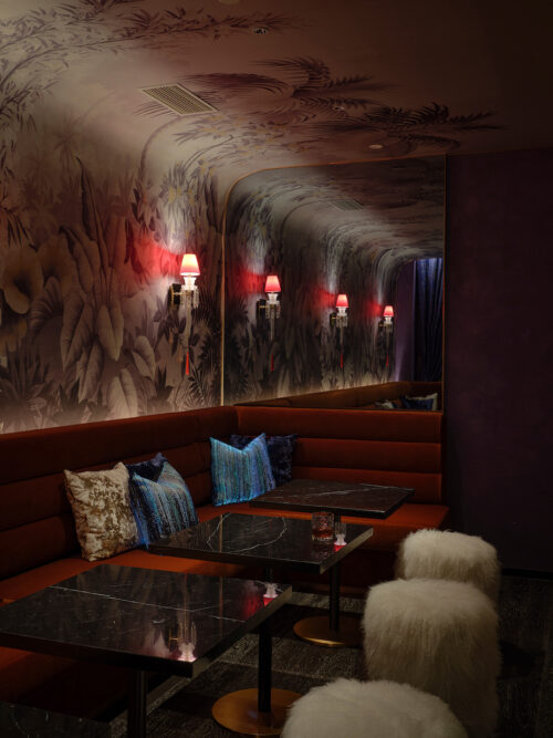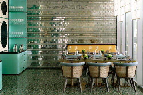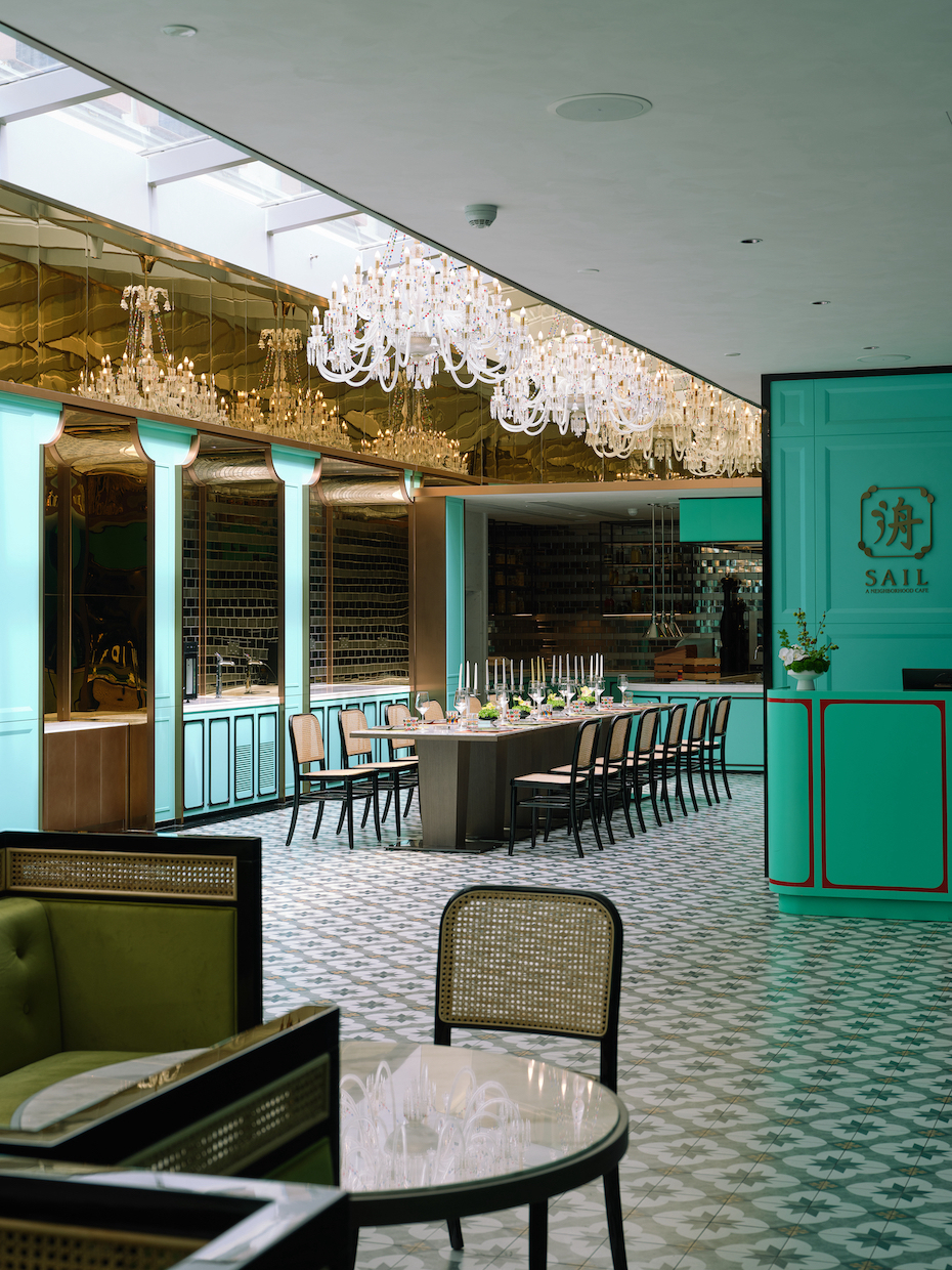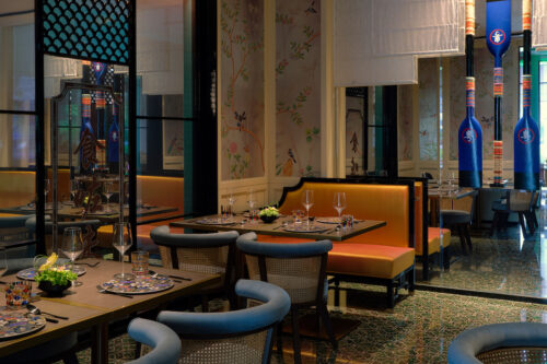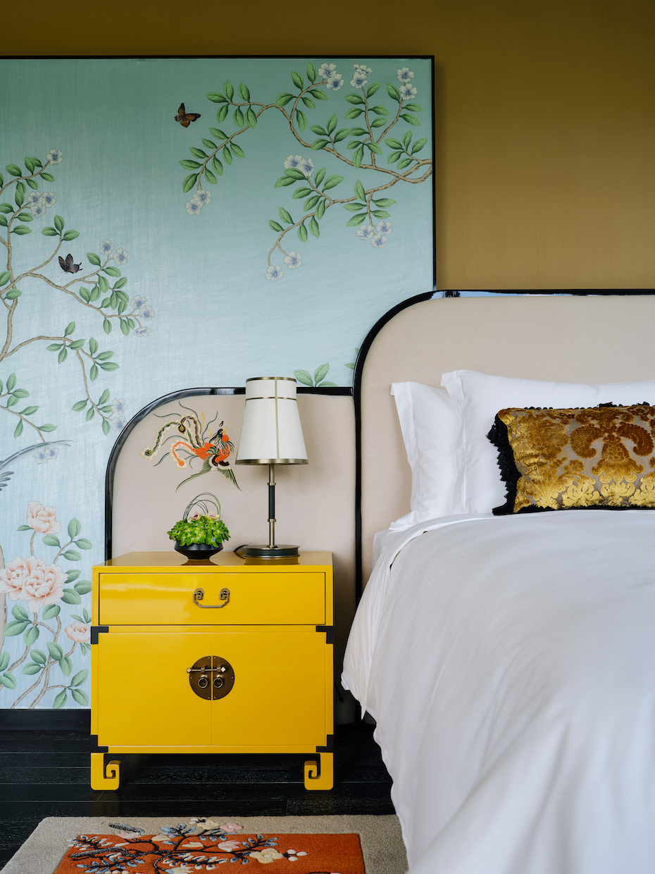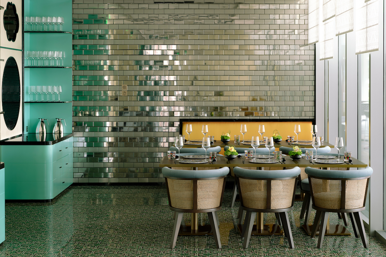 The all-day dining restaurant dares a Tiffany-green palette — exuberant, chic, and unashamedly photogenic — offset by brass and lacquered timber. Guestrooms carry the conversation further: silk, velvet, and rattan mix with unexpected jolts of colour, each suite dressed like a bespoke ensemble.