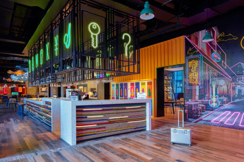 The façade, a kaleidoscope of reflective panels, riffs on the geometry of shipping containers and the motion of waves — a subtle nod to the city’s legendary container terminal. Inside, the story flips from heritage to high-voltage pop. The bar glows like a stage set, the lobby bursts with comic-book graphics, and neon signs trace Ningbo’s nightscape in electric pinks and cobalt blues.