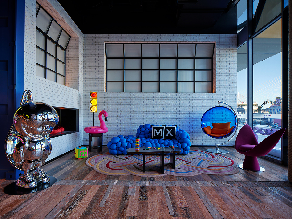 Every material tells a story of repurposing and rebellion: corrugated steel walls reimagined as sculpture, terrazzo floors that recall dockside grit, and installations that laugh out loud — from glowing underwear icons to pop-art murals of urban play.