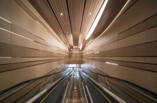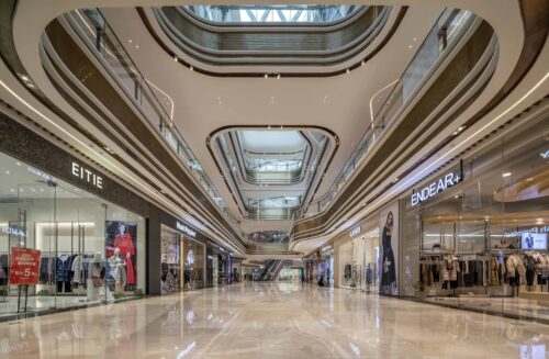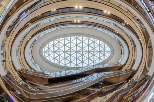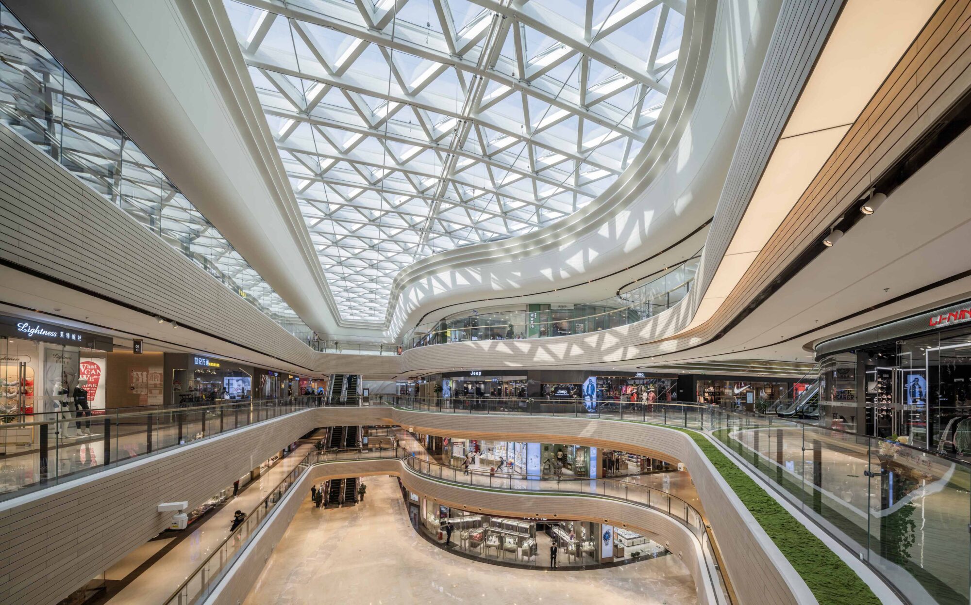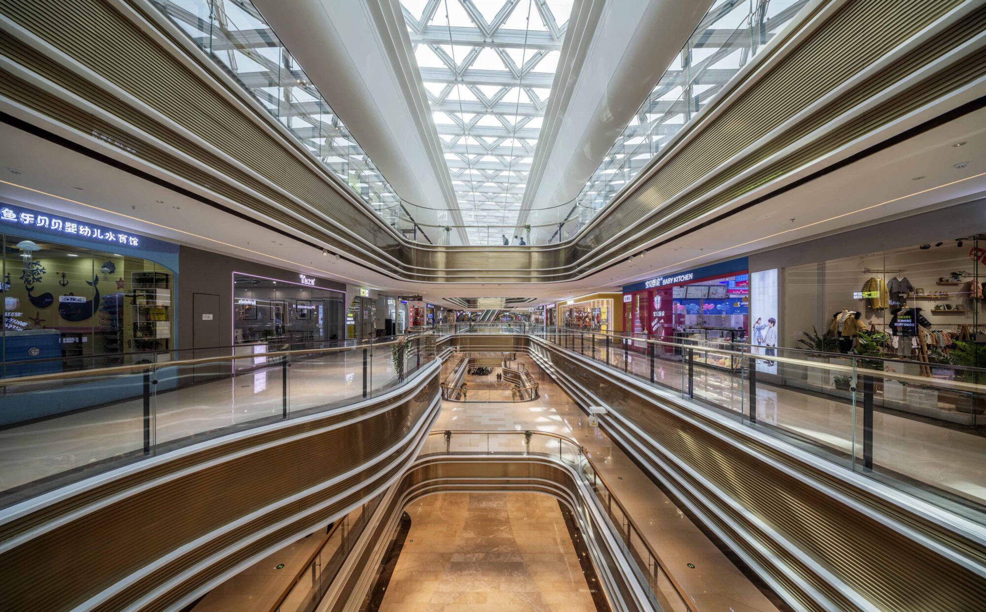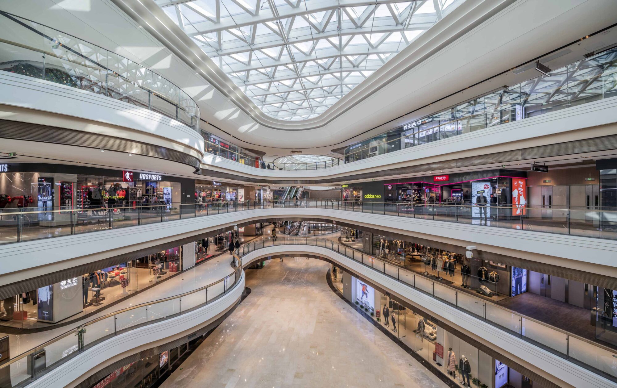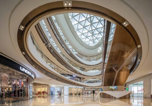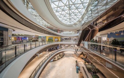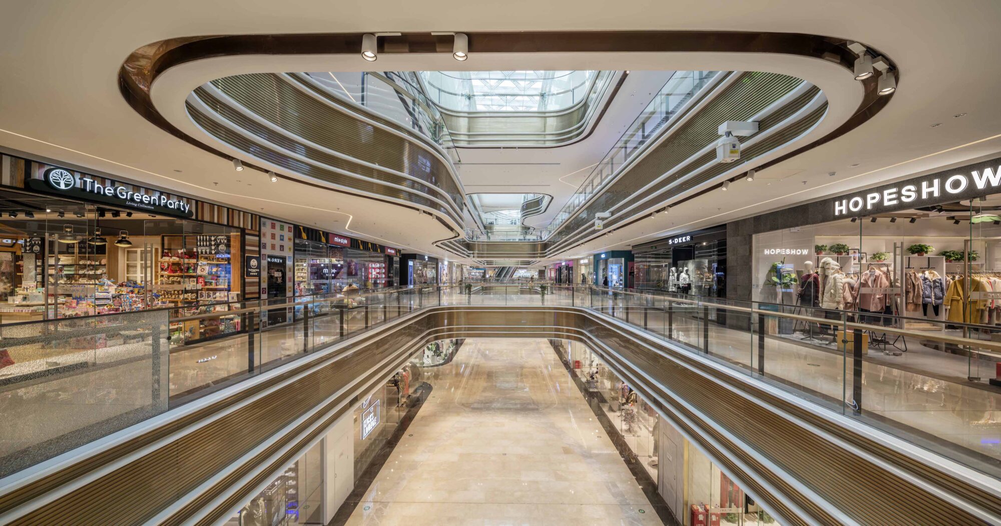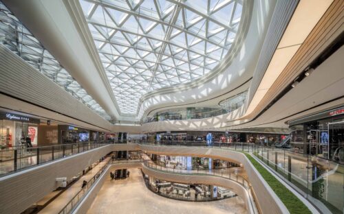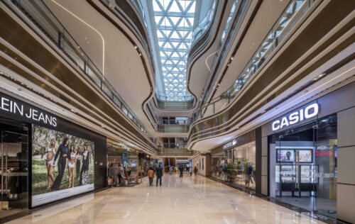A series of elongated atriums structure the interior, ensuring clear sightlines and intuitive circulation across multiple levels. Curved balcony edges soften the scale of the building while maintaining visual continuity, allowing the architecture to support — rather than compete with — the retail programme.